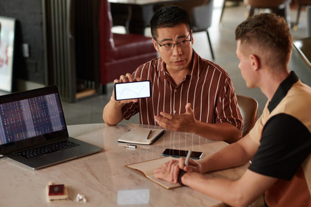 Financial Advisor showing trading chart on smartphone to coworker in meeting