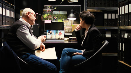 Agents meet with witnesses on videocall, conducting investigation and writing statements to help in solving criminal case. Partners using online telework videoconference to interview people.