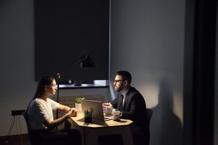 Coworkers sitting at desktop and discussing new concept in work. Two millennial employees talking about business plan and success result in office at night shift. Overtime work in the evening