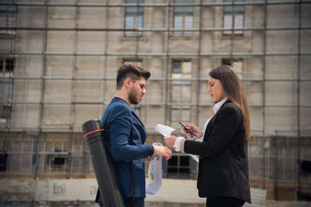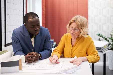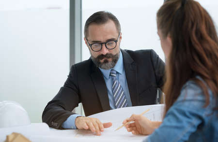 Couple of professional architects sitting at table an examining blueprint of new construction project in team at table