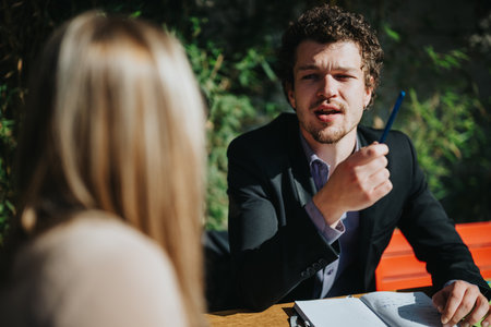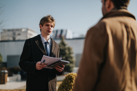 Young professional in a dark coat speaks with a colleague outdoors, holding notebooks during a discussion