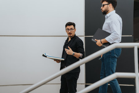 Business partners discuss documents outdoors in smart attire, sharing notes and ideas