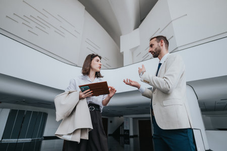 Two colleagues discuss ideas in a modern atrium, with notebook and binder, during a business conversation