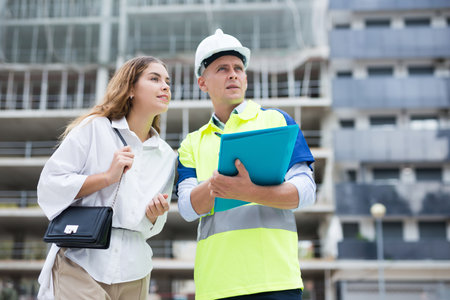 Construction manager and engineer dressed in orange work vests and hard helmets explore construction documentation on the building site near the steel frames