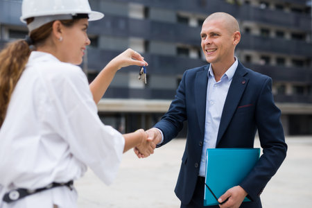 Full length portrait of two successful business people shaking hands while standing at construction site, copy space