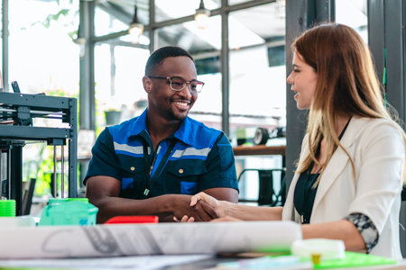 Male engineer collaborates with female product designer, review technical blueprints in design studio. Emphasizing interdisciplinary teamwork, planning, drawings in 3D printing and product development