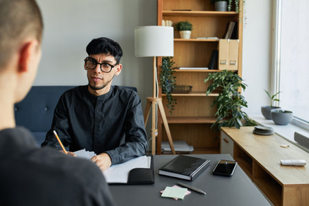 Horizontal over-the-shoulder shot Hispanic HR manager sitting in front of unrecognizable young female job applicant listening to her