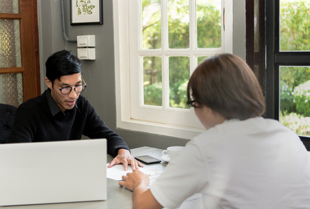 Serious young Asian business lady listening to ideas of finance manager department at meeting