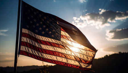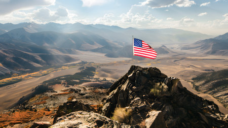 a person standing on top of a hill with a flag in front of the sun setting behind them and red clouds. Generative AI