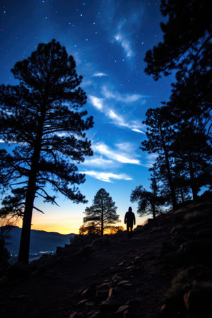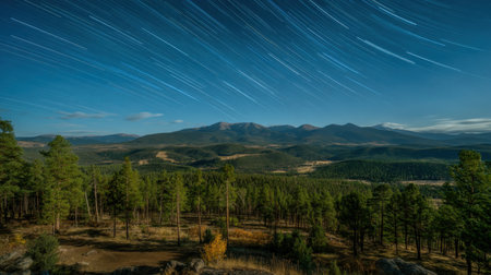 Captivating view of a starry night sky illuminating a serene mountain landscape with lush pine trees, capturing the tranquility of nature.