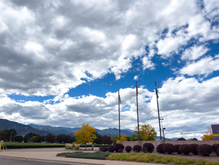 Colorado Springs, CO, USA-September 30, 2025 - The Broadmoor World Arena grounds feature flagpoles with the American, Colorado, and Broadmoor flags waving in the wind. Autumn trees with golden foliage line the landscaped foreground with the Rocky Mountain