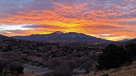 A breathtaking sunset illuminates the sky with vibrant hues of orange and purple, casting a warm glow over snow-capped mountains and a peaceful valley below.