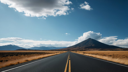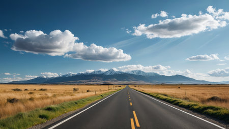 Puffy clouds, mountains, and empty highway in summer time. Colorado, USA.
