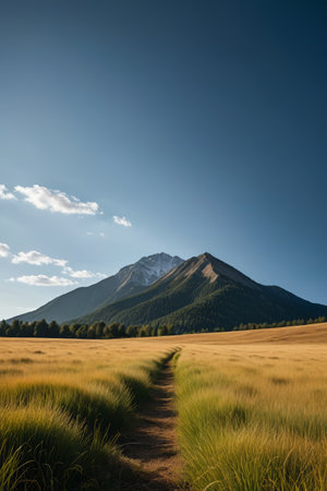 A breathtaking mountain landscape showcasing vibrant autumn colors. The winding path leads through lush trees, creating a peaceful retreat for nature lovers.