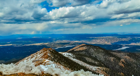 Panorama of winter mountains, snow-covered slopes of Pikes Peak mountains, Colorado, USA
