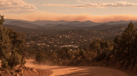 Warm sunset hues illuminate a vast mountain valley featuring a winding dirt path through trees and a sprawling city nestled below the rugged peaks