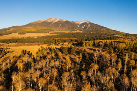 Aerial of snow capped San Francisco Peaks with golden aspens
