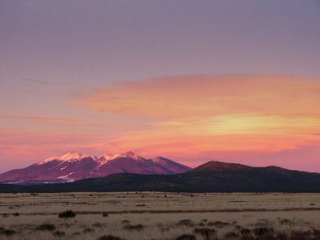 the San Francisco Peaks and lenticular clouds in Arizona lit by evening alpenglow