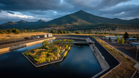 A tranquil landscape featuring a calm body of water surrounded by lush vegetation and mountains under a dramatic sky, capturing the beauty of nature and serenity.