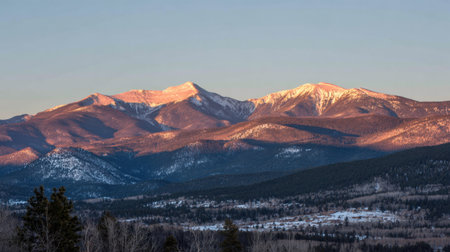 A breathtaking view of snow-capped mountains at sunrise, showcasing vibrant colors against a clear sky. Perfect for evoking a sense of peace and natural beauty.