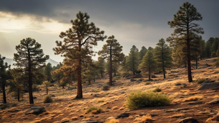 the desert landscape stretches out under a grey, rainy sky, where deciduous trees and firs stand tall, their leafy canopies and evergreen branches swaying gently in the wind, as the misty atmosphere adds a mystical touch to this serene and peaceful scene. ai generated