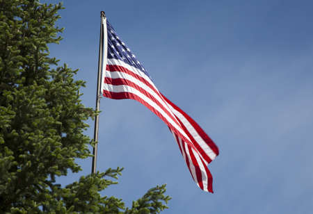Front view of American flag on flagpole fluttering in wind on sky background.