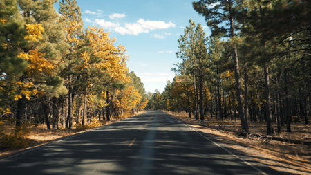 Drive Car On Road Through Pines Forest On Autumn Sunny Day