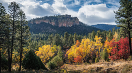 The Los Alamos forest comes alive in autumn, displaying a stunning array of colorful foliage. Bright yellows and reds contrast with the green trees and dramatic cliffs under a blue sky.