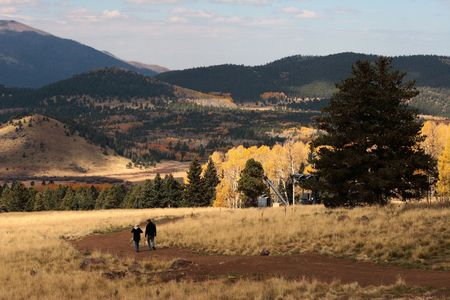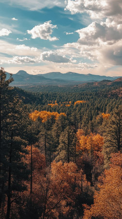 The vibrant colors of autumn illuminate the Los Alamos forest, with trees displaying rich oranges and yellows against a backdrop of distant mountains under a cloudy sky.
