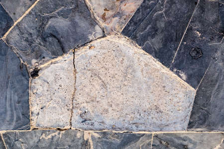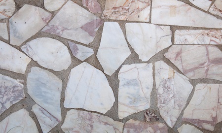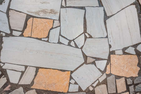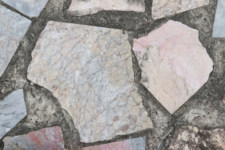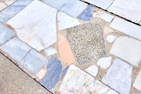The texture of the sidewalk from pieces of marble and granite tiles arranged in a chaotic manner with streaks of cement