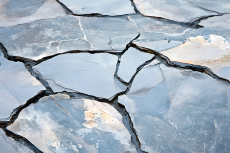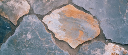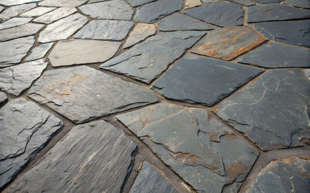 Close-up view of cracked slate stone tiles creating a textured and uneven surface