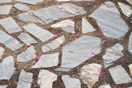Stepping stones in the garden with fallen flower petals