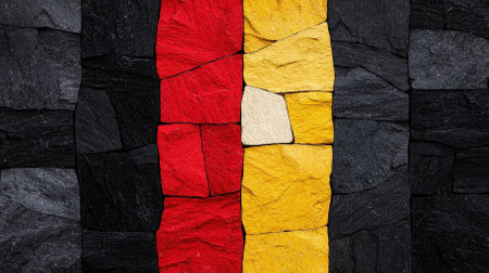 A visually striking stone wall featuring a bold design of black, red, and yellow colors arranged in geometric patterns, ideal for creative projects.