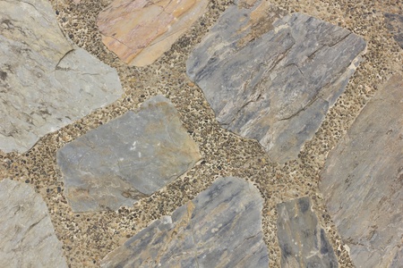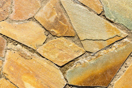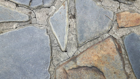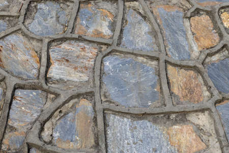 A close-up of the stone material used for outdoor walkways, showcasing its natural and rugged texture with different shades of gray-brown and blue tones. The stones have unique shapes that add character to each section of an elegant patio or pathway, providing artistic contrast against surrounding greenery. This photo highlights how stone is suitable not only as a decorative element but also in functional use like walking paths. --ar 3:2 --v 6.1 Job ID: 5cc8dbf2-7d9f-4789-9d8f-611c7df49888