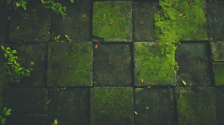 Aerial view of ancient moss-covered brick floor pattern for natural design inspiration
