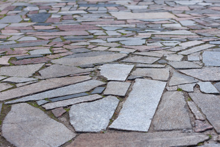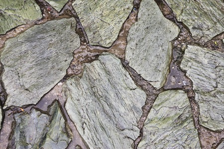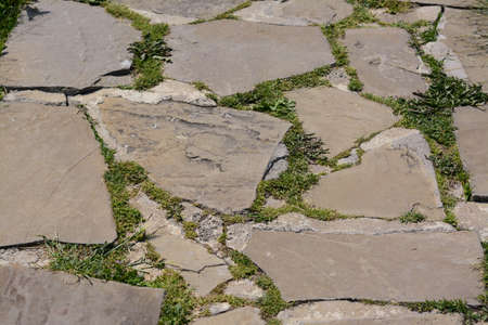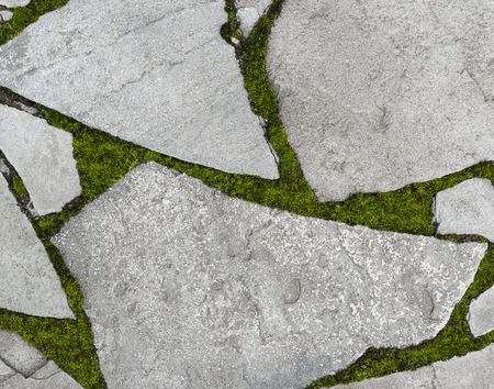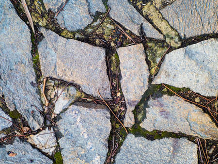 Old Stone Road or Pavement Closeup. Granite Sidewalk with Moss.