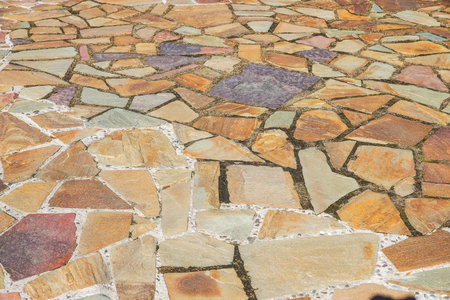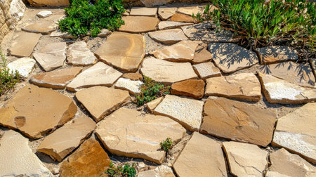 Sunlight illuminates an irregular stone paving, creating a rustic and textured pathway with varying shapes and sizes of stones, adding character to an outdoor space