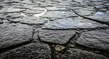 A close-up view of a dark, irregular stone pavement after rainfall, with small puddles reflecting the sky. The wet surface creates a high-contrast texture that emphasizes the rugged, natural patterns of the masonry.