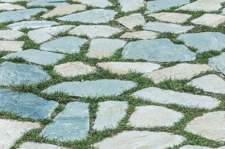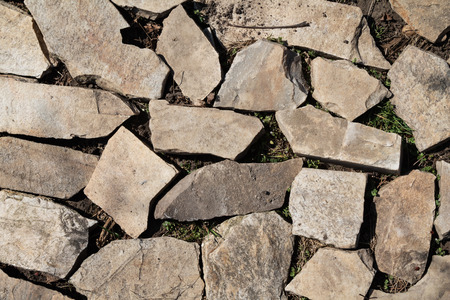 Garden, village, city path made of large stones in dry land and grass. Abstract background, texture, frame, pattern. A sunny day in the village. Rural, rustic landscape