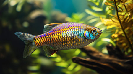 A colorful rainbowfish swimming in an aquarium with plants and driftwood, highlighting its iridescent scales.