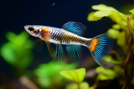 A close-up of a guppy swimming near green plants in a clear aquarium.