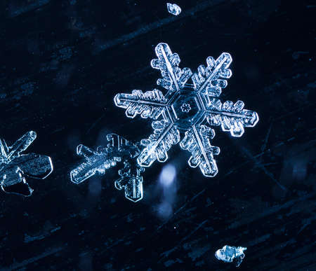 Snowflake on a dark blue background. Macro photo with shallow depth of field.