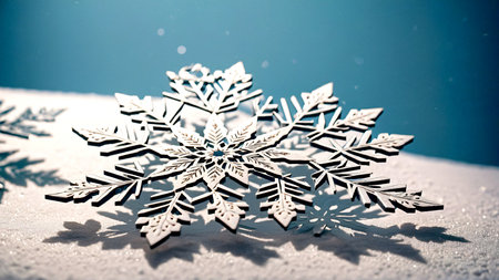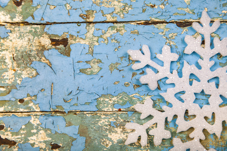 Christmas snowflake on blue wooden background.