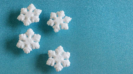 White decorative snowflakes on the aqua blue Christmas background. Banner photo, top view, space for your text.