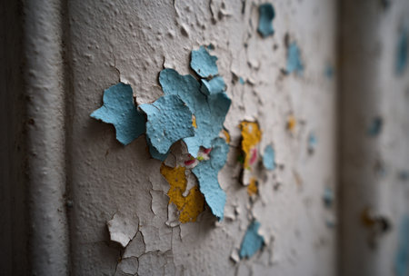 Close-up of peeling paint on an aged wall, revealing layers of color