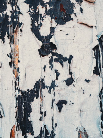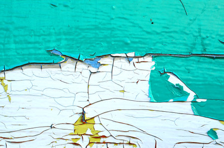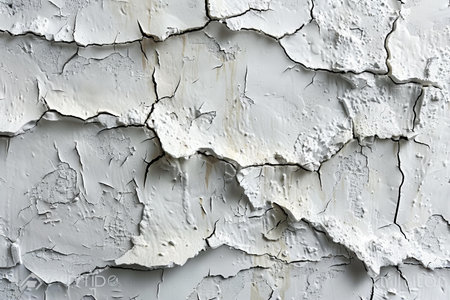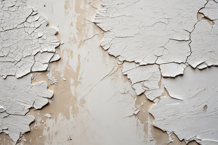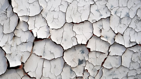 Cracked white paint creates interesting texture, showcasing mix of smooth and rough surfaces. peeling layers reveal contrast between underlying color and top layer, evoking sense of age and wear