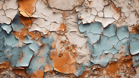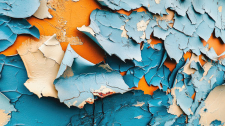 This close-up image captures a weathered surface with peeling paint in vibrant blue and orange hues, showcasing an artistic, textured backdrop ideal for creative projects.