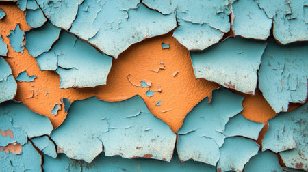 A close-up view of a weathered surface featuring vibrant blue and orange paint peeling away, showcasing texture and intricate details suitable for various design projects.