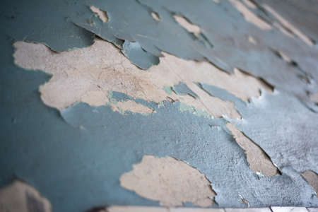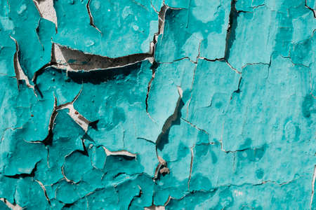 Peeling Blue Aquamarine Color Paint from the Wall. Shattered Plaster Background