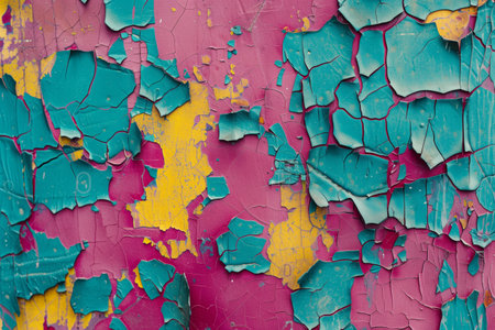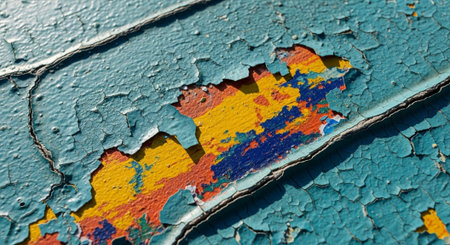 A detailed close-up of peeling paint reveals striking textures and vibrant colors, perfect for backgrounds, design projects, or artistic expressions.